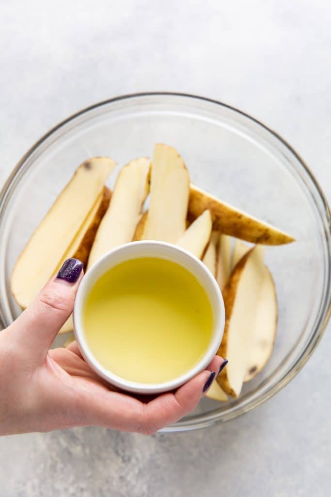 - Return to a dry bowl. Drizzle potato wedges with olive oil and toss to coat. Sprinkle with salt, pepper, and paprika and toss again to coat evenly.