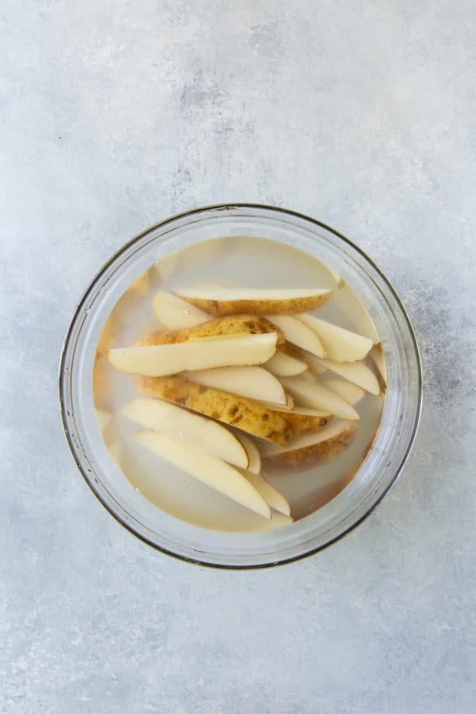 - Cut potatoes into 6 to 8 wedges each and place them in a large bowl. Cover with cold water and soak for 15 minutes.
