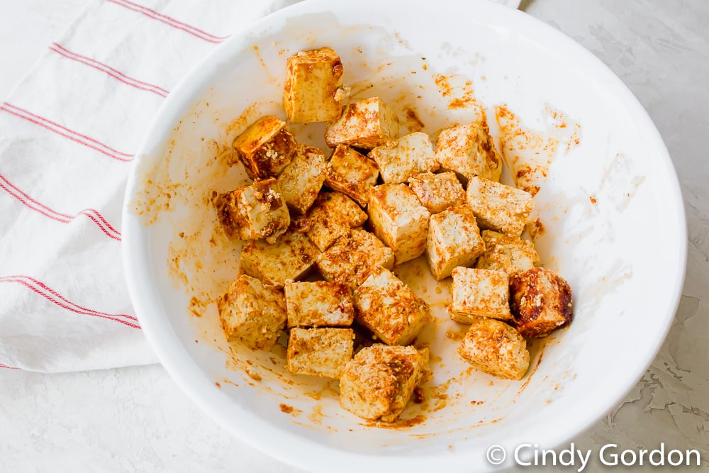 - Remove tofu from the press. Cut tofu into cubes. Put cubes into a large mixing bowl and add oil, spices, and cornstarch. Gently stir.