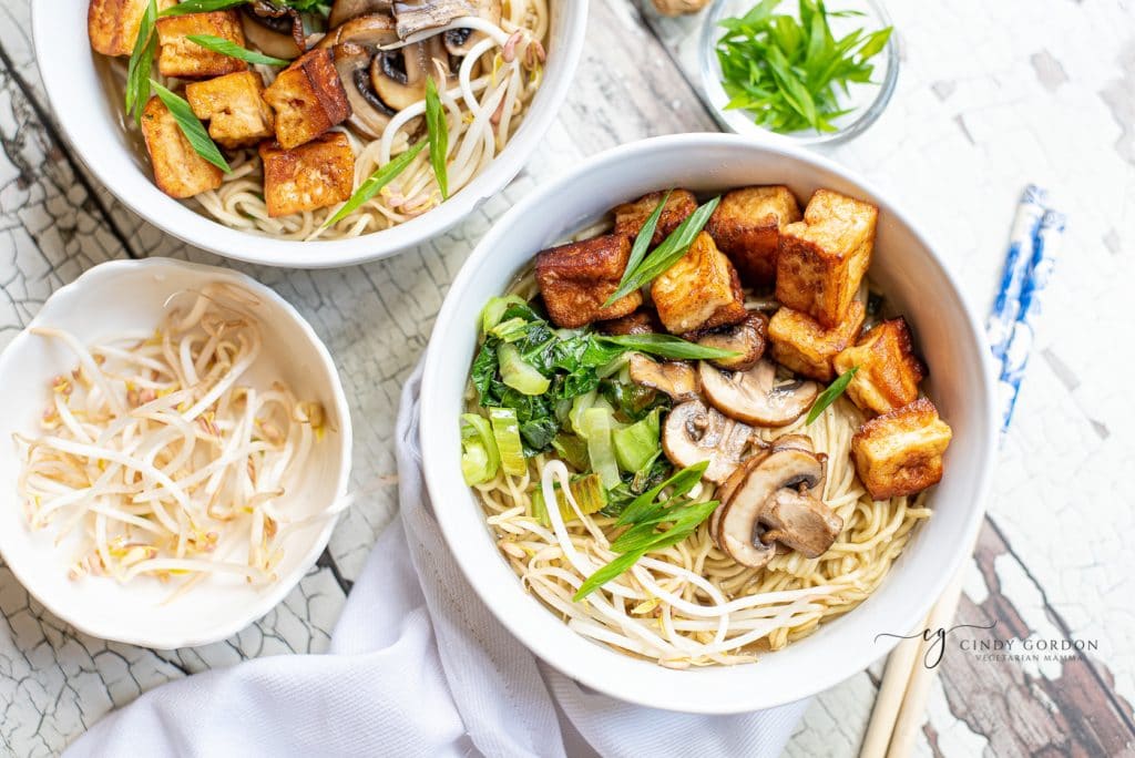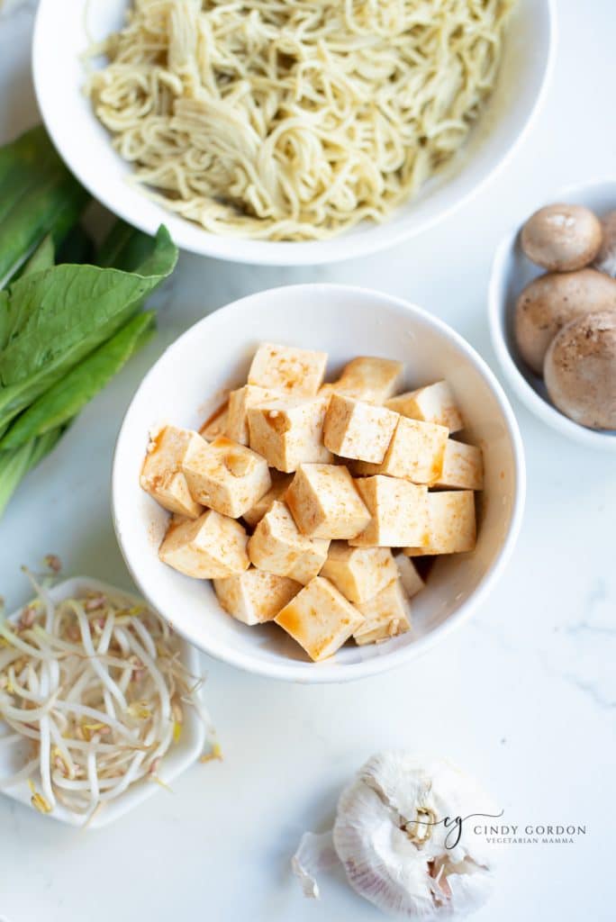 - To assemble the soup, add noodles to the bowl, and top with broth. Add crispy tofu, and all your veggies.