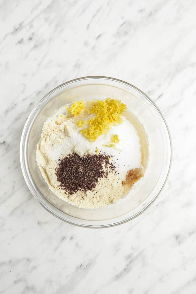 - In another bowl, combine almond flour, sugar, lemon zest, poppy seeds, lemon juice, and vanilla extract.