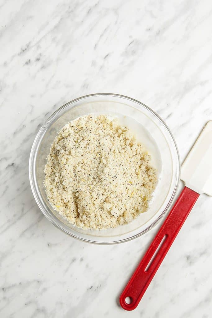 - Now, mix the almond flour, sugar, lemon zest, poppy seeds, lemon juice, and vanilla extract together in another bowl.