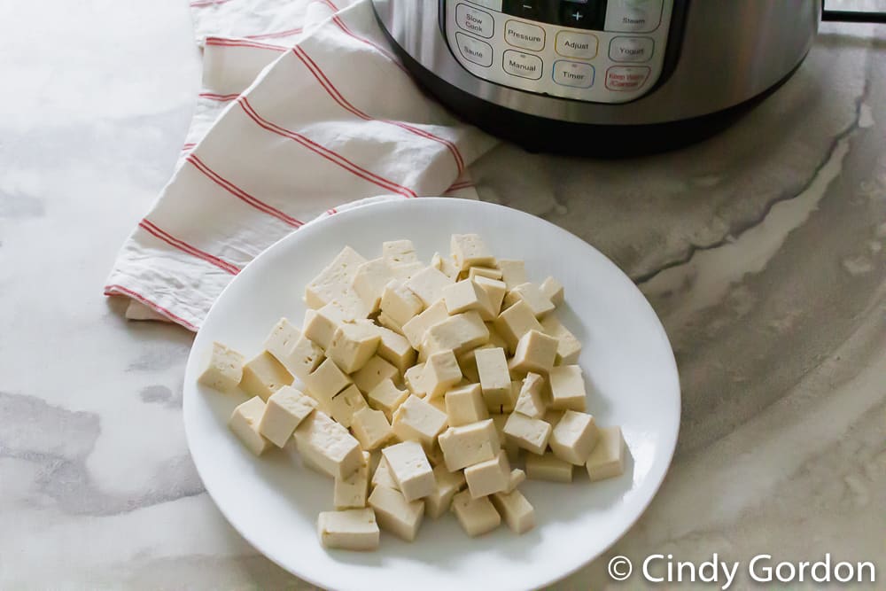 - First, press the tofu for 10 to 12 minutes using the EZ Tofu Press. Turn the knobs every 2 to 3 minutes as the tofu drains. Once drained and cut into cubes, put the tofu in your Instant Pot.