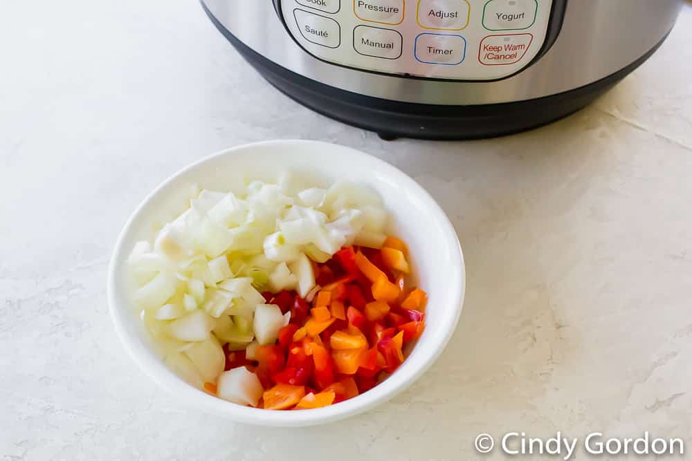 - Place oil, onions, and bell peppers into Instant Pot. Use sauté function to soften onions and bell peppers.