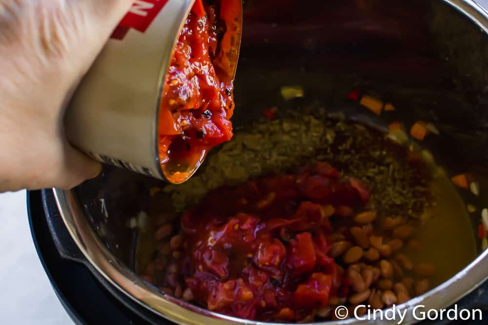 - Finally, add the diced tomatoes and tomato paste. Stir to combine everything and cover the Instant Pot. Set your pressure cooker on high for 16 minutes.