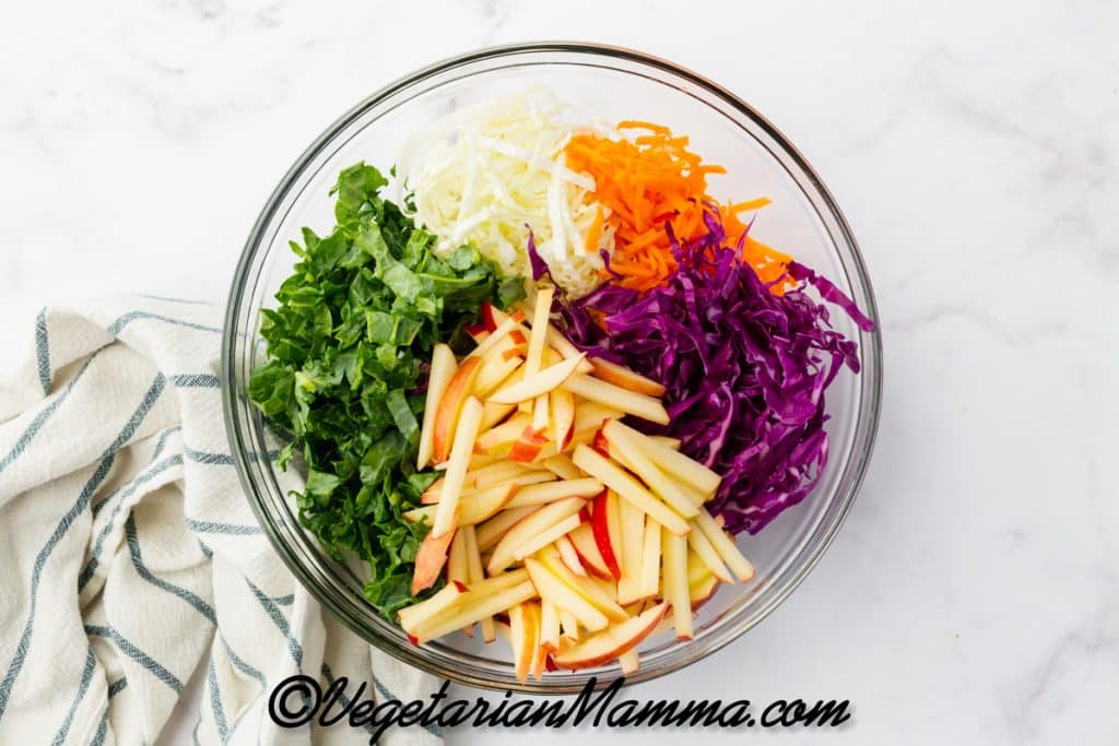 - Add the kale, red cabbage, green cabbage, apples, and carrots to a large bowl.
