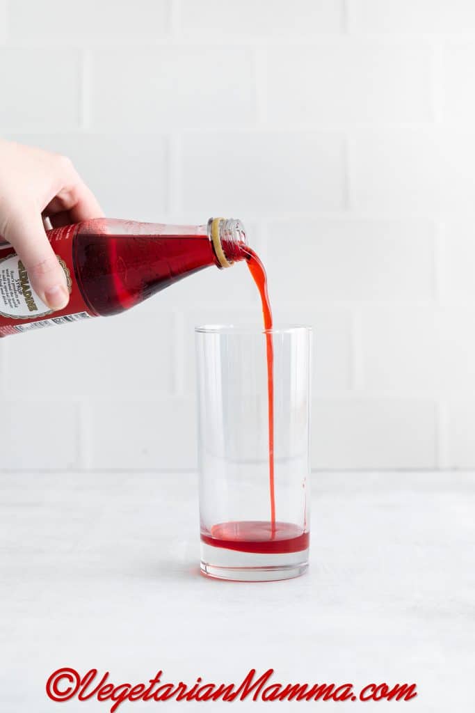 - Add the grenadine to a highball glass and then fill it with ice.