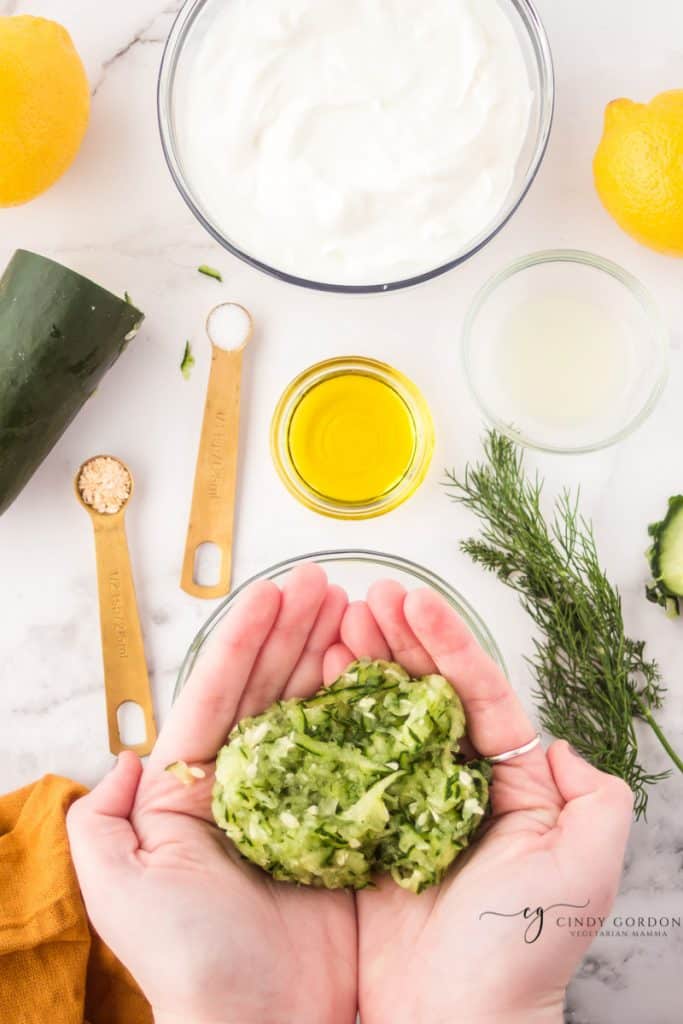 - Grate the cucumber. No need to peel or deseed. Squeeze out any excess liquid.