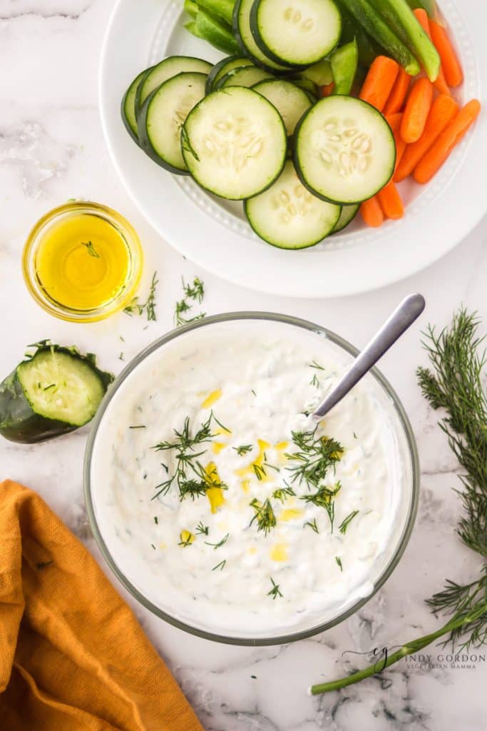 - All you need are some fresh cucumbers, tangy Greek yogurt, a few lemons, and some olive oil, of course. And don't forget the dill! I also garnish mine sometimes with mint or extra oil, too.