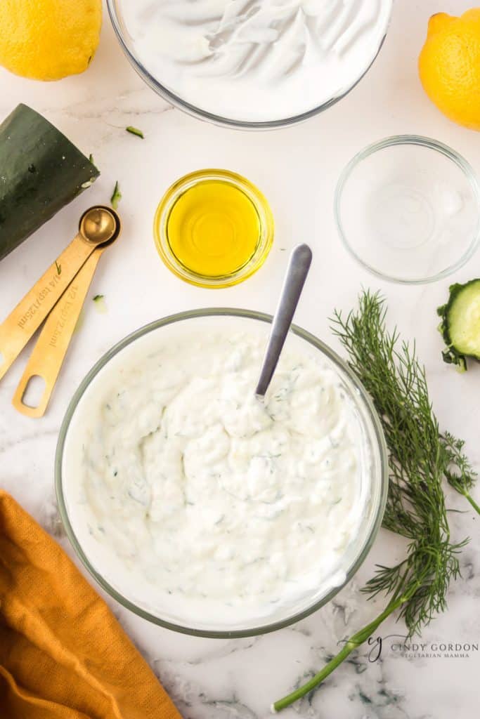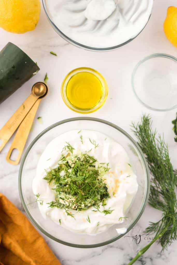 - Mix grated cucumber with Greek yogurt, minced garlic, salt, fresh lemon juice, and 1 tablespoon of dill. Mix until fully combined.