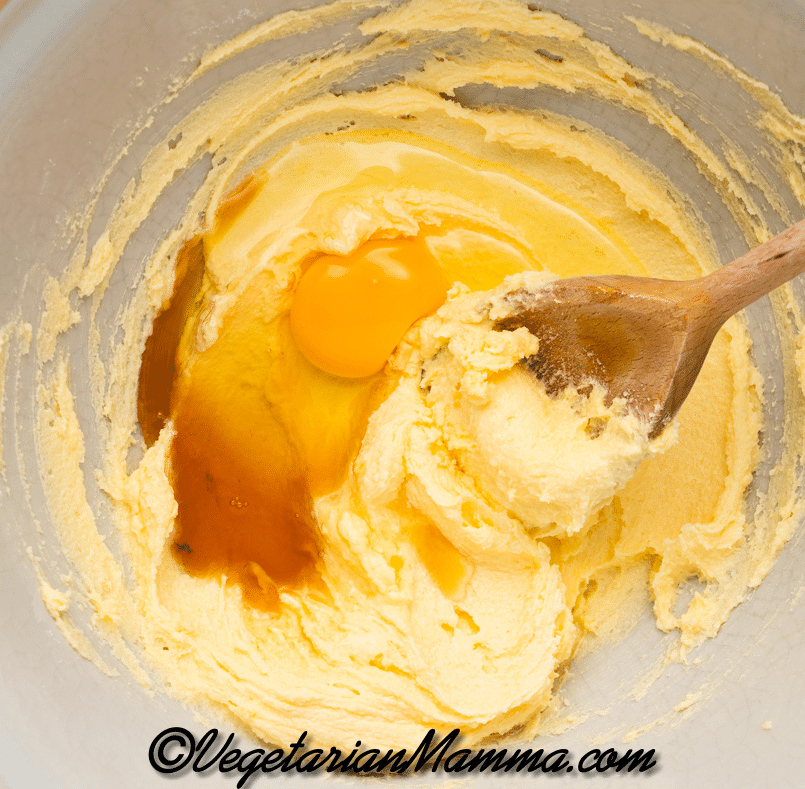 - Add the egg and vanilla extract and beat to combine.