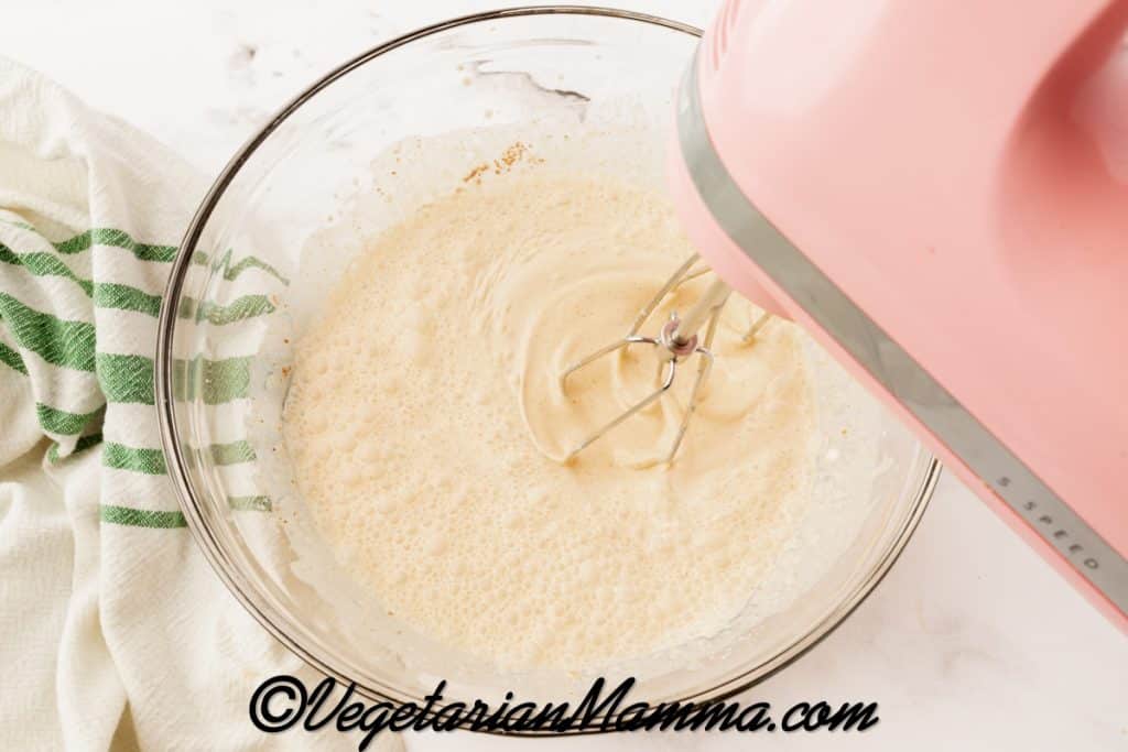 - With an electric mixer, whip for 3-4 minutes, until stiff peaks form.