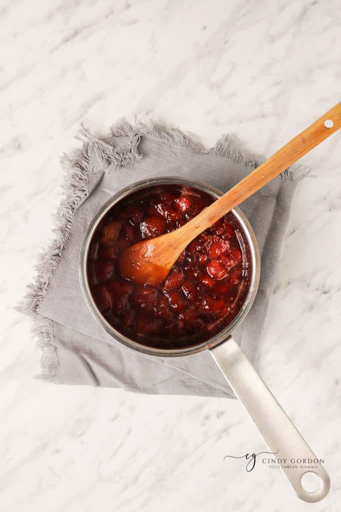 - Put strawberries, sugar, and water in a saucepan. Cook over medium-low, stirring often, until slightly thickened.