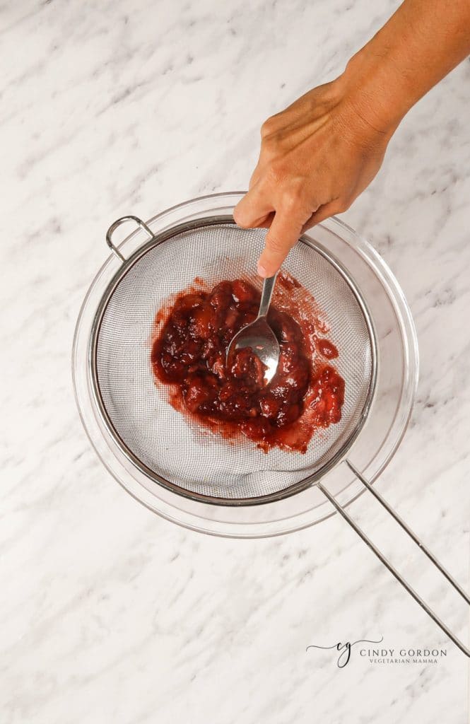 - Set a fine mesh strainer over a bowl, and pour the strawberry mixture through the strainer. Using the back of a spoon, press the strawberries through the strainer to extract all the juices.