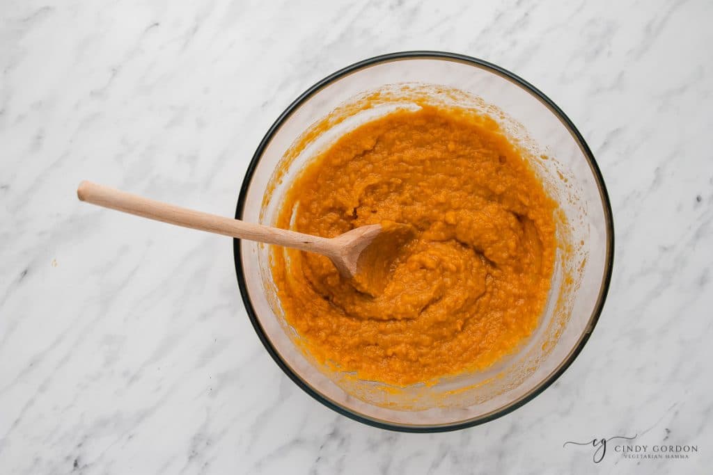 - In a large mixing bowl, beat together the mashed sweet potato, almond butter, vegan butter, maple syrup, vanilla extract, and almond milk.