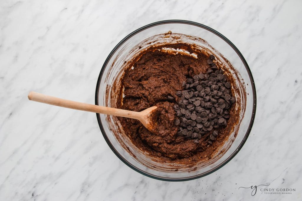 - Next, add the chocolate chips to the vegan sweet potato brownie batter.