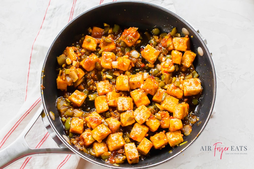 - Add air fried tofu to the skillet and let it simmer another 5 minutes, stirring occasionally.