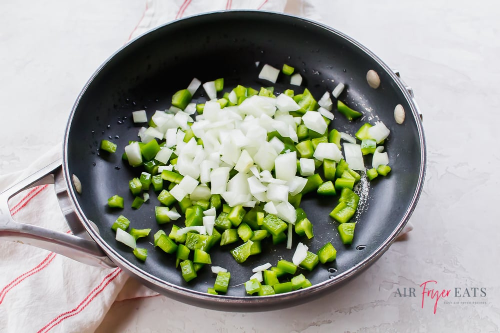 - While tofu cooks, make Manchurian sauce. Sauté onions and peppers until softened.