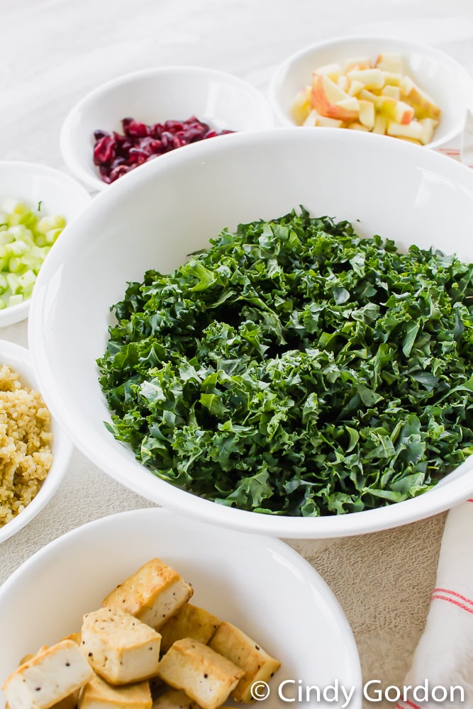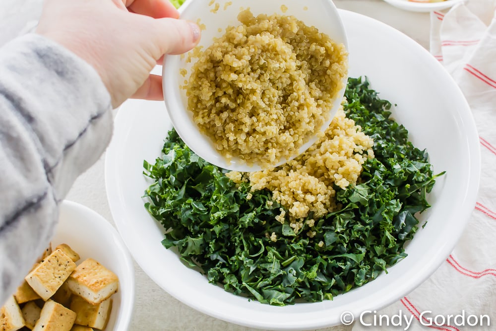 - First, add the cooked quinoa to a mixing bowl with your kale. Make sure to massage the kale first to make it a little less bitter and break down the fibrous bits.