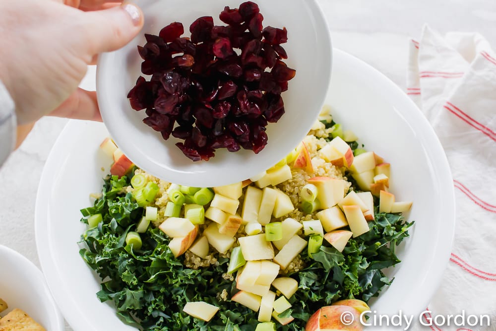 - Add apples, green onions, and dried cranberries to bowl with kale and quinoa.