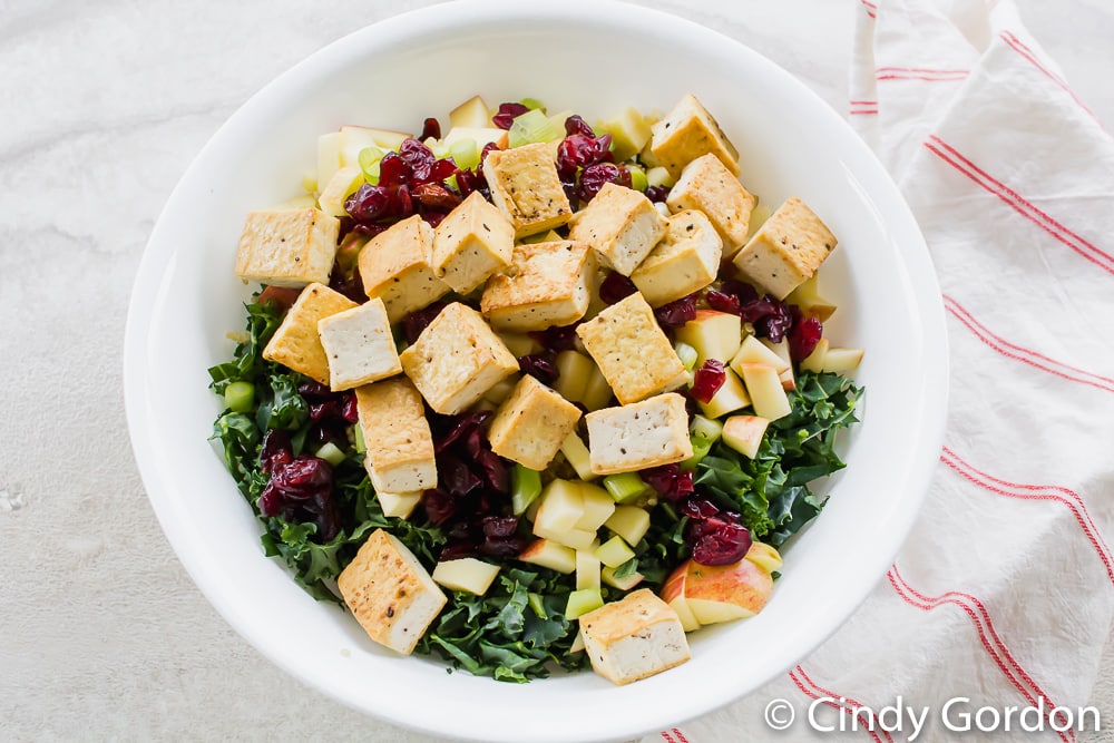 The kale brings some bitterness, the apple has some sweetness, the cranberries bring tartness, and the onions and tofu bring the savory punch. To have a great salad, you want to have an array of ingredients like this to not have it all sweet or all tart.