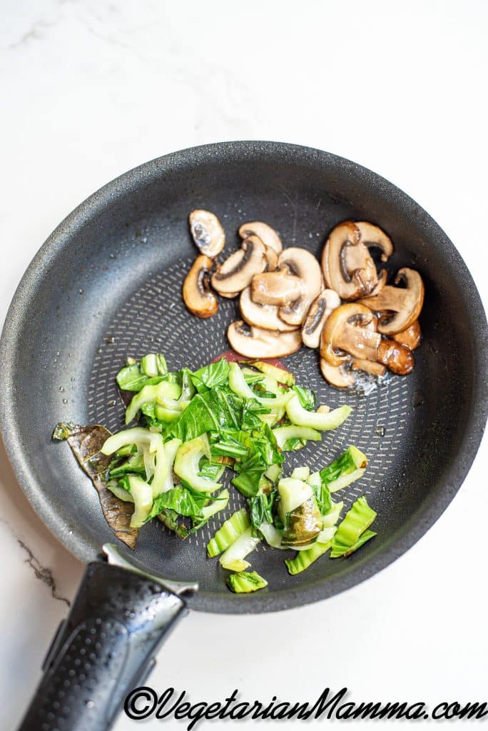 - Heat a nonstick skillet with oil. Cook mushrooms and boy choy until tender. Divide noodles