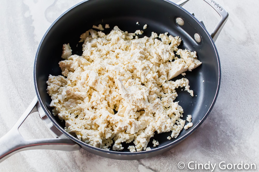 - Warm oil in a large skillet over medium heat. Sauté tofu cubes, and mash them with a fork to make crumbled tofu.