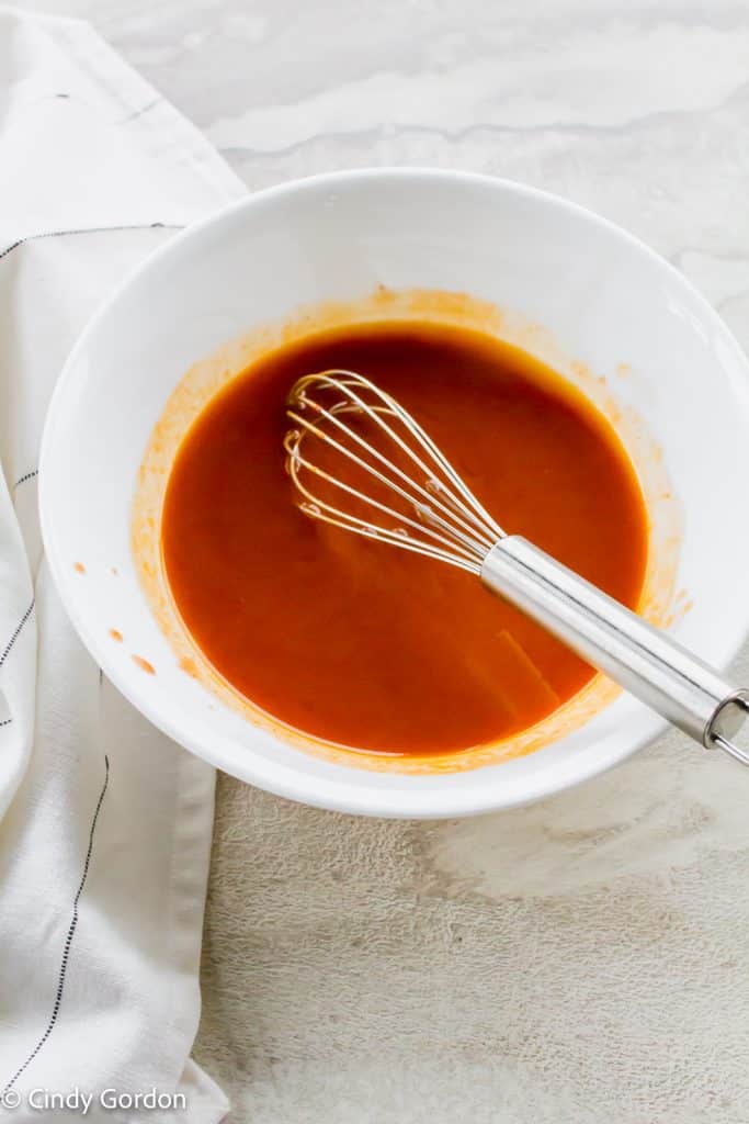 - Then, pour the hot sauce, vegan butter, garlic powder, cayenne pepper, and vegan Worcestershire sauce into a mixing bowl and whisk to combine.