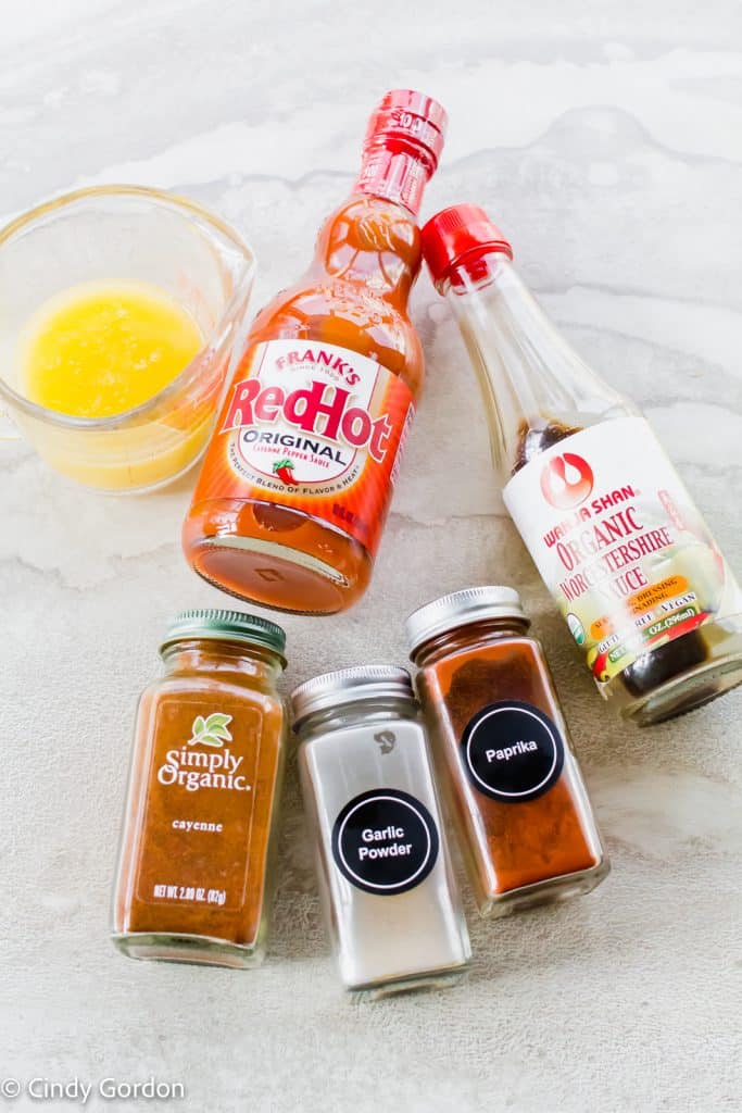 - Add hot sauce, melted vegan butter, garlic powder, paprika, cayenne pepper, and vegan Worcestershire sauce to a mixing bowl.