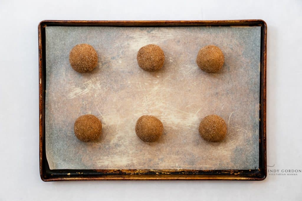 - Shape the cookie dough into balls. Roll each ball in cinnamon sugar.