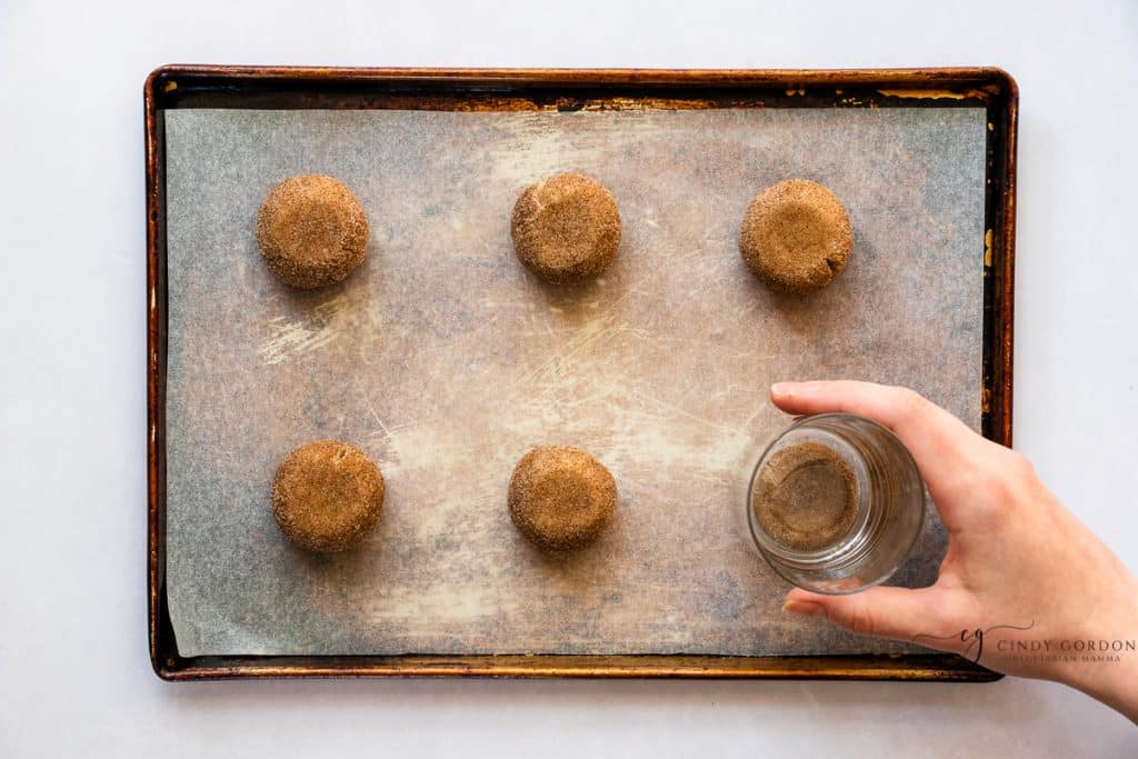 - Flatten each dough ball on the baking tray with a glass or your hand.