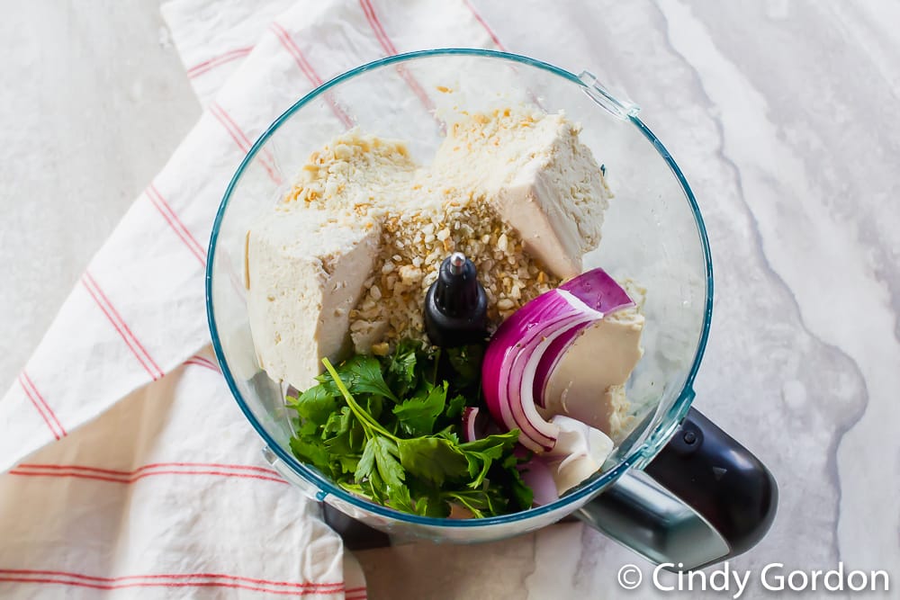 - Next, put the pressed tofu, bread crumbs, red onion, parsley, garlic salt, oregano, and liquid smoke in a food processor.