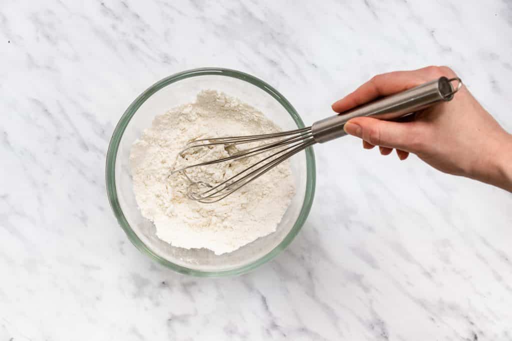 - In a separate bowl, whisk together gluten-free all-purpose flour, xanthan gum, salt, and baking soda.