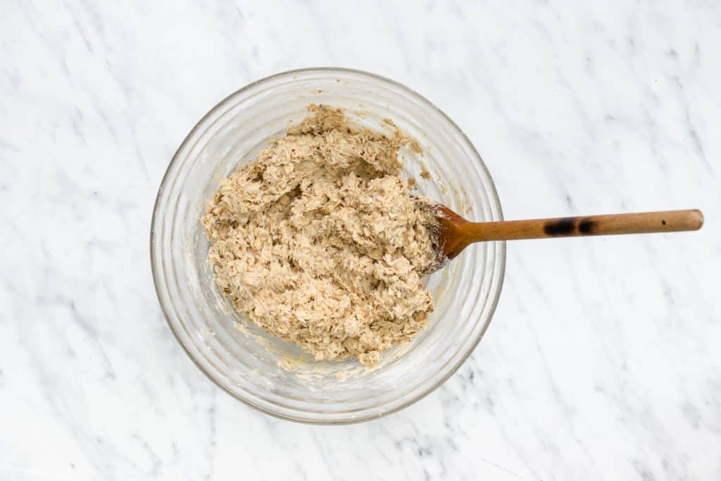 - Then, add the dry ingredients to your wet ingredients as well as the rolled oats. Fold it together until you have a wet, sticky dough.