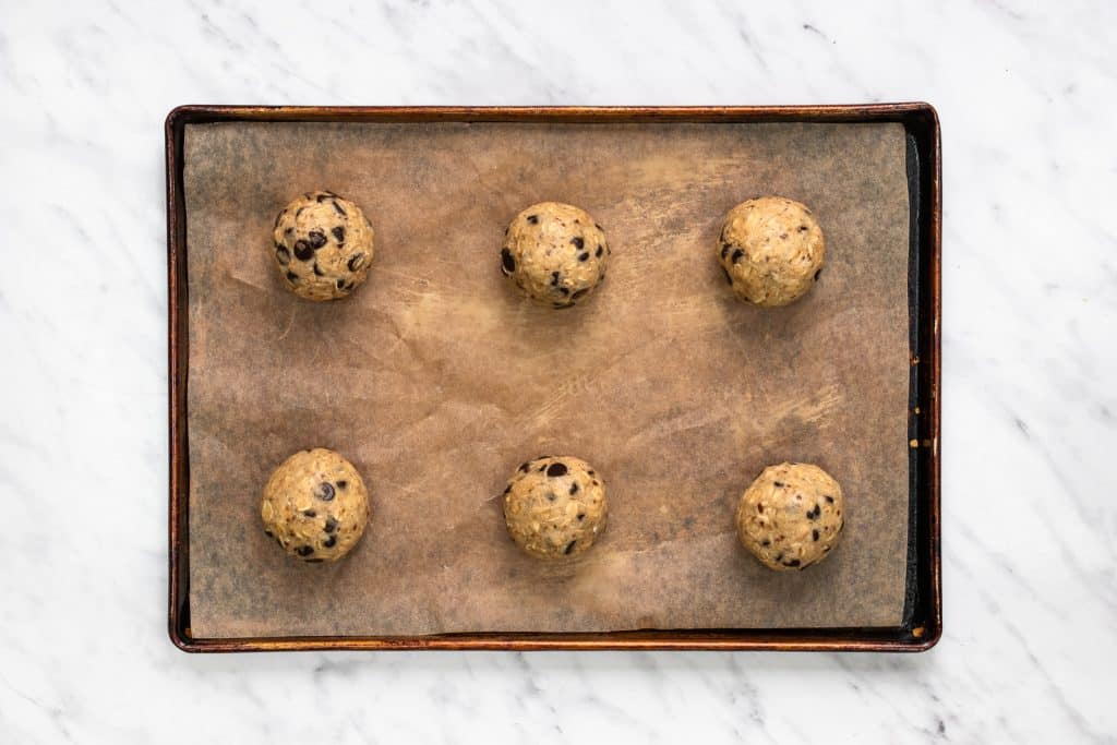 - Roll the mixture into 2-inch balls (about 60g each). Spread out on prepared baking sheet. Flatten each cookie slightly with your hand. You may need to make 2 batches.