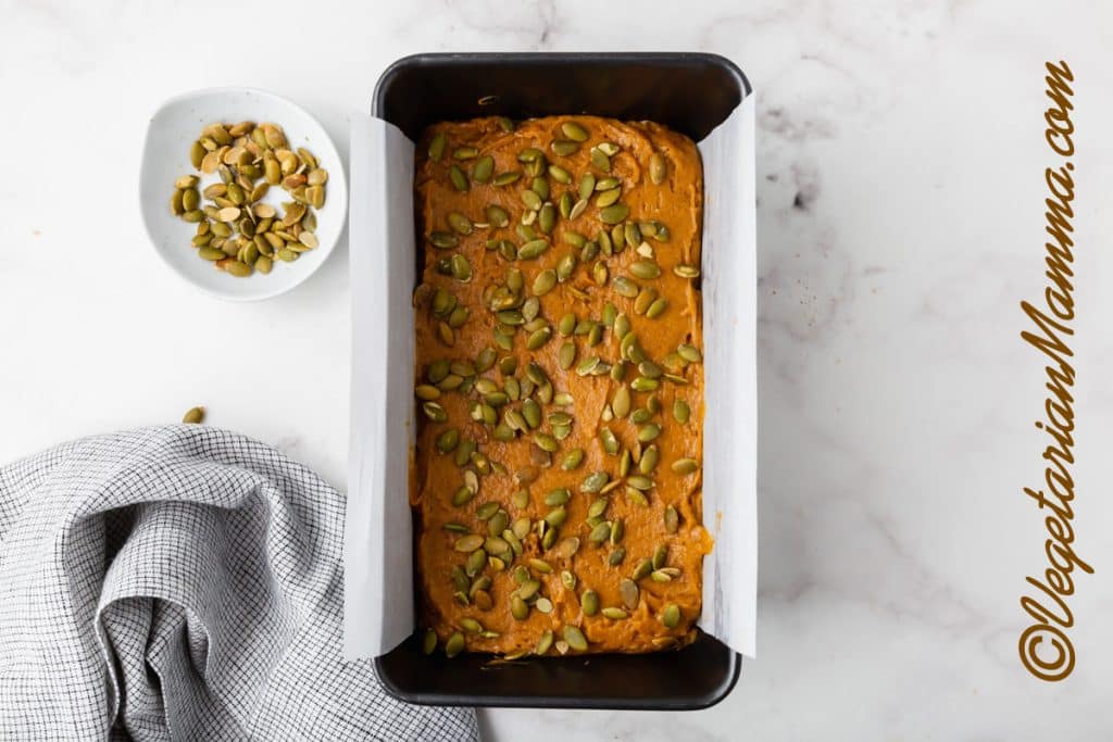 - Sprinkle pepitas over the batter.