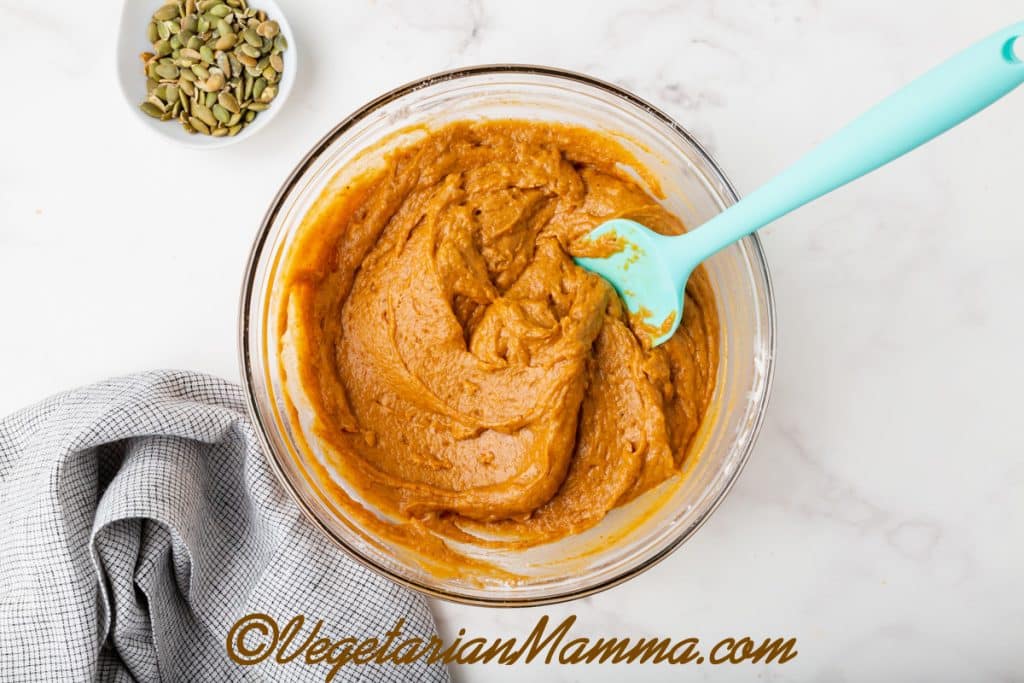 - Then, in another mixing bowl, add the brown sugar, pumpkin puree, vegetable oil, unsweetened almond milk, apple cider vinegar, and vanilla extract.