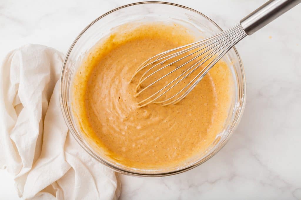 - In a medium bowl, stir together almond milk, pumpkin puree, granulated sugar, vegetable oil, apple cider vinegar, and vanilla extract until combined.