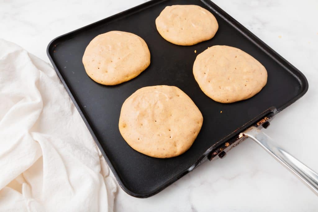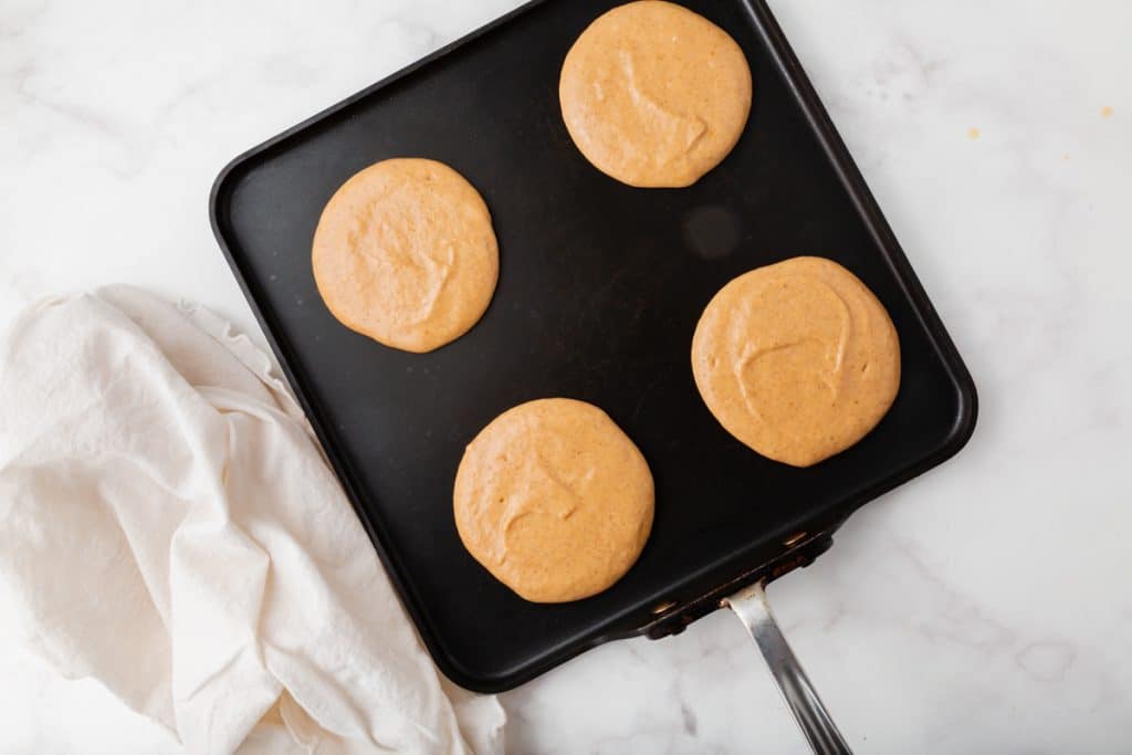 - Use a ¼ cup measuring cup to scoop batter onto the griddle. Cook a few pancakes at a time so that you do not overcrowd the pan.