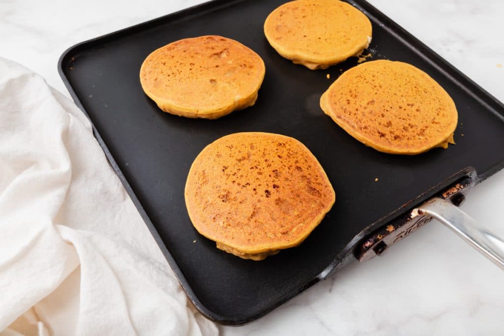 - Preheat a non-stick griddle over medium-low heat. Lightly grease the pan, wiping away any excess oil.