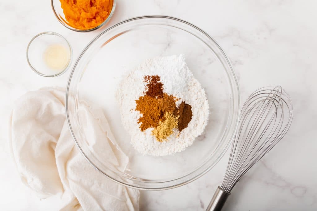 - First, whisk together the gluten-free flour, baking powder, baking soda, cinnamon, nutmeg, ginger, allspice, cloves, and salt.