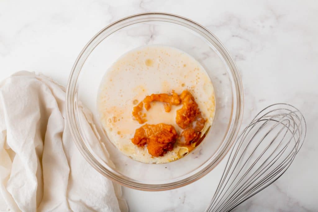 - Then, in another mixing bowl, add the almond milk, pumpkin, sugar, vegetable oil, vinegar, and vanilla.