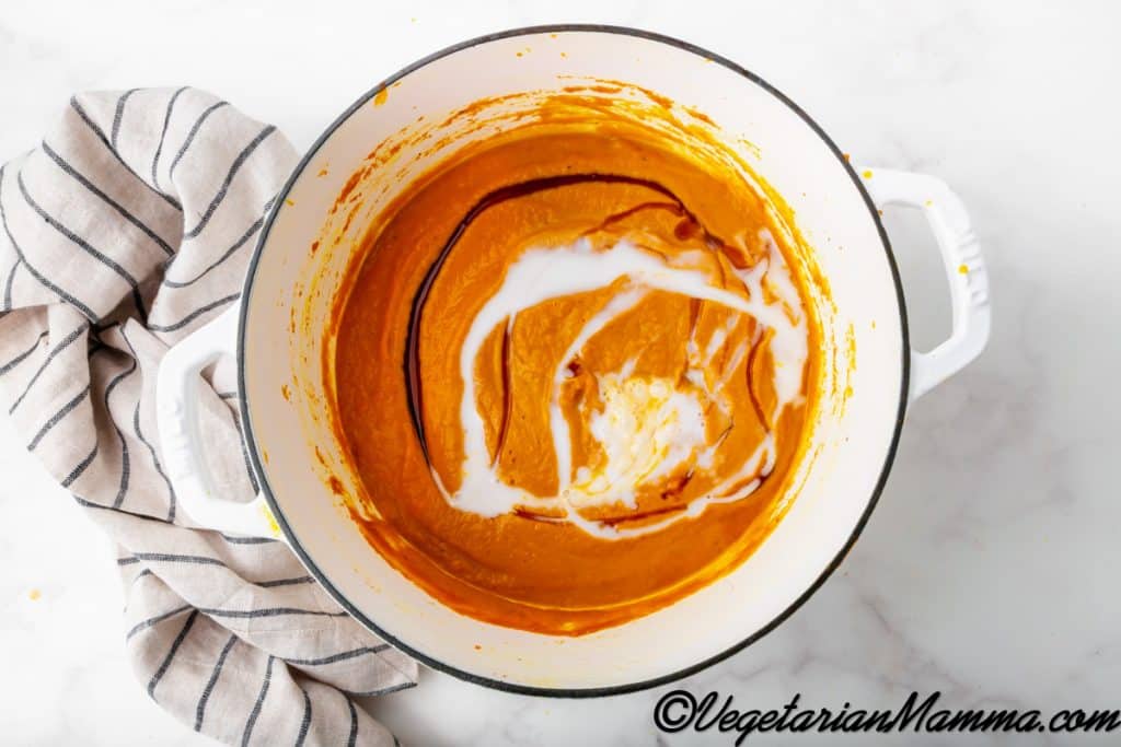 - Now, add the vegetable broth to the mix and stir until the pumpkin puree is smooth.