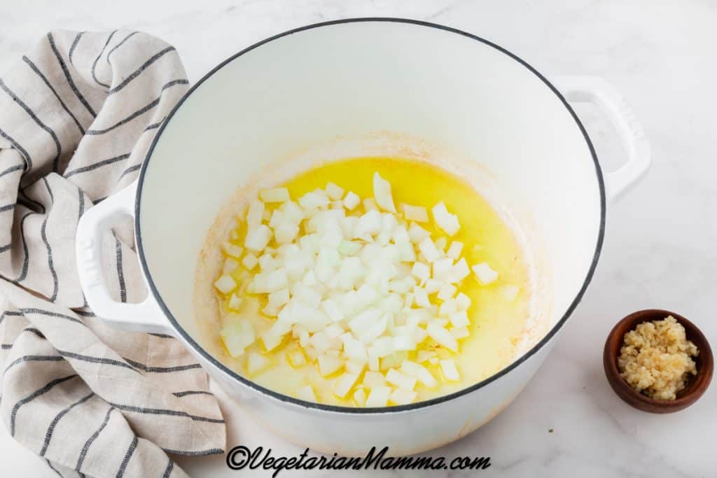 - Heat olive oil in a large pot over medium heat. Then, add the diced onion and cook for 3 to 4 minutes, until translucent and starting to brown.