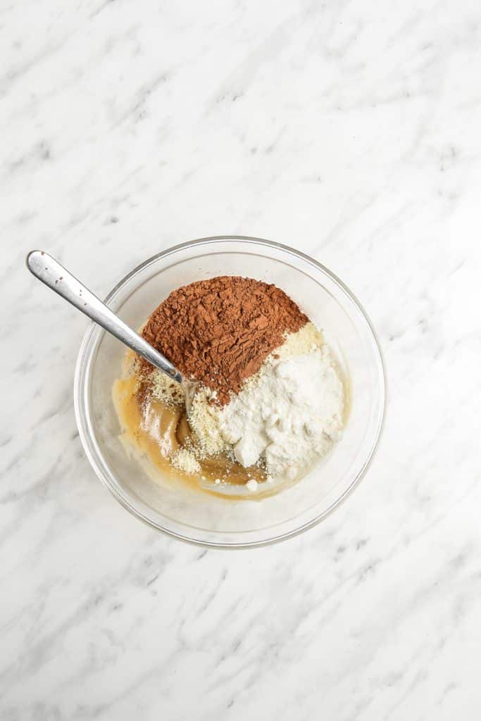 - Add the almond flour, cocoa powder, coconut flour, and salt. Stir until a cookie dough consistency forms. It should be doughy and moist but not overly wet.