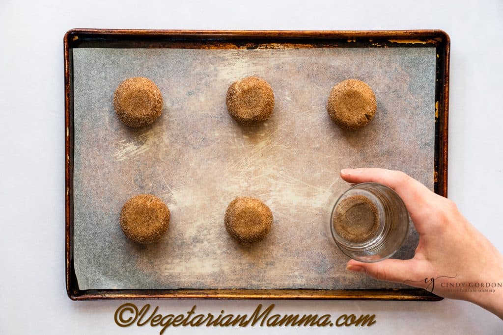 - Put the snickerdoodle cookie dough on the baking sheets and flatten each ball slightly with a glass or your hand.