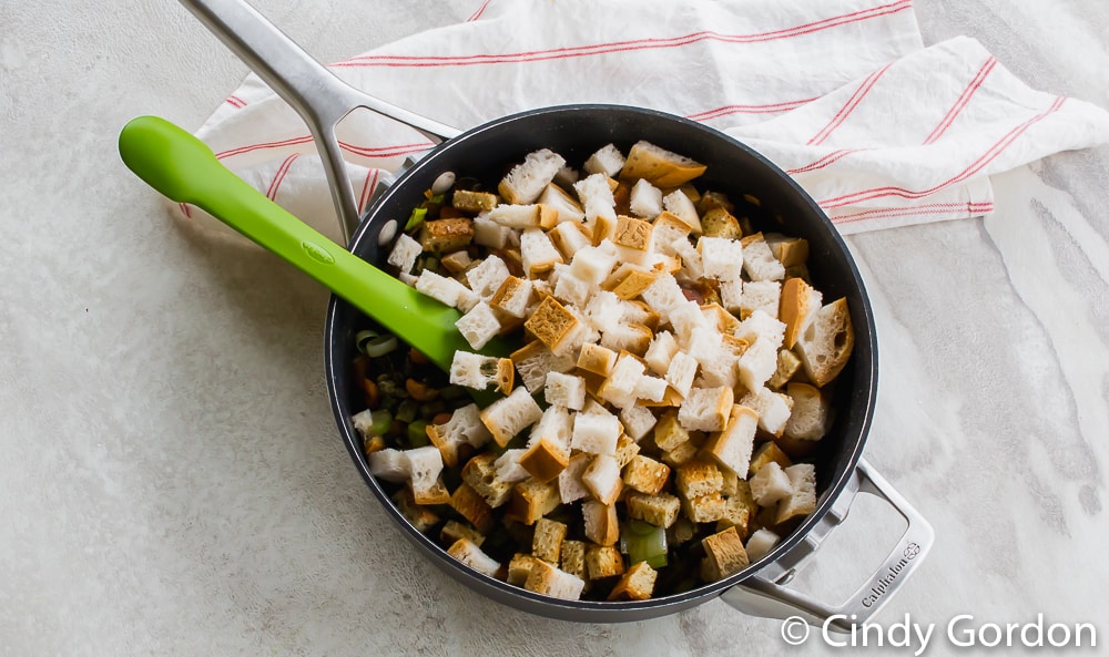 I use half dry bread and half soft bread, so I dice the other half right before cooking. Want to do it all ahead of time? Dice up your bread and leave half out to dry and half in an airtight container to keep moist!