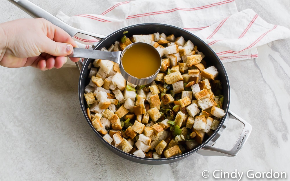 - Add the vegetable broth to the mixture to moisten. Taste at this point to see if it needs more seasoning. If so, add more poultry seasoning, salt, and pepper.
