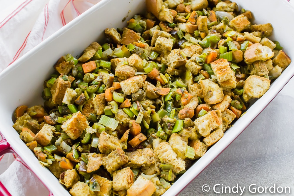 - Finally, add the vegetable broth to moisten the bread slightly — but not soggy — and taste the mixture. If the flavors are right, pour your bread mixture into an oiled 9x13 baking dish and bake about half an hour or until your stuffing is golden brown. Enjoy!