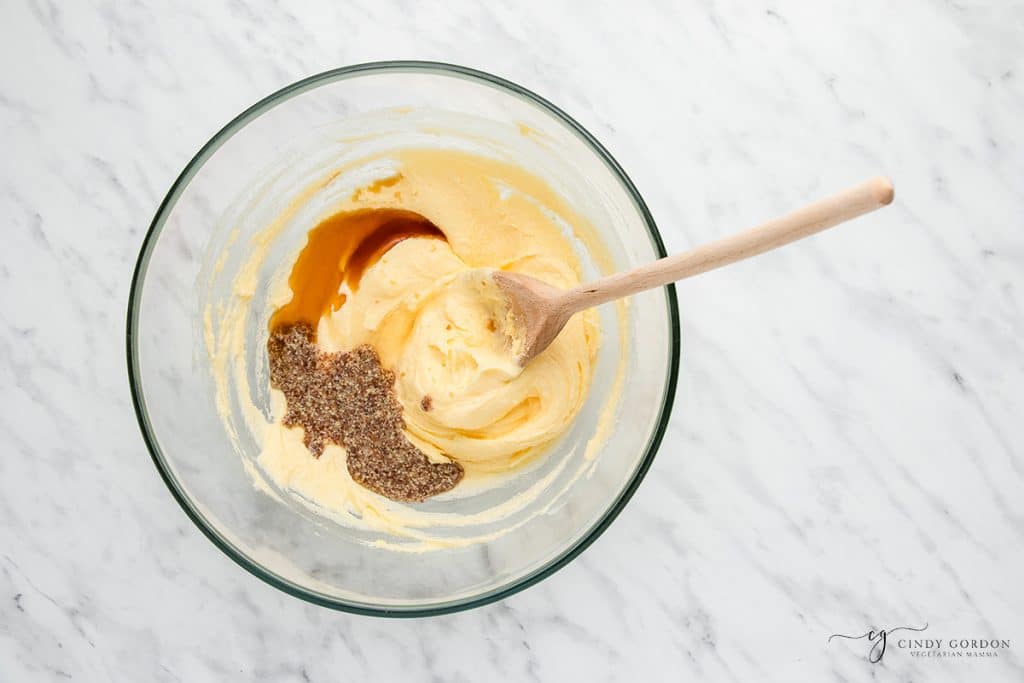 - Add the flax egg, vanilla extract, and lemon juice. Mix well.